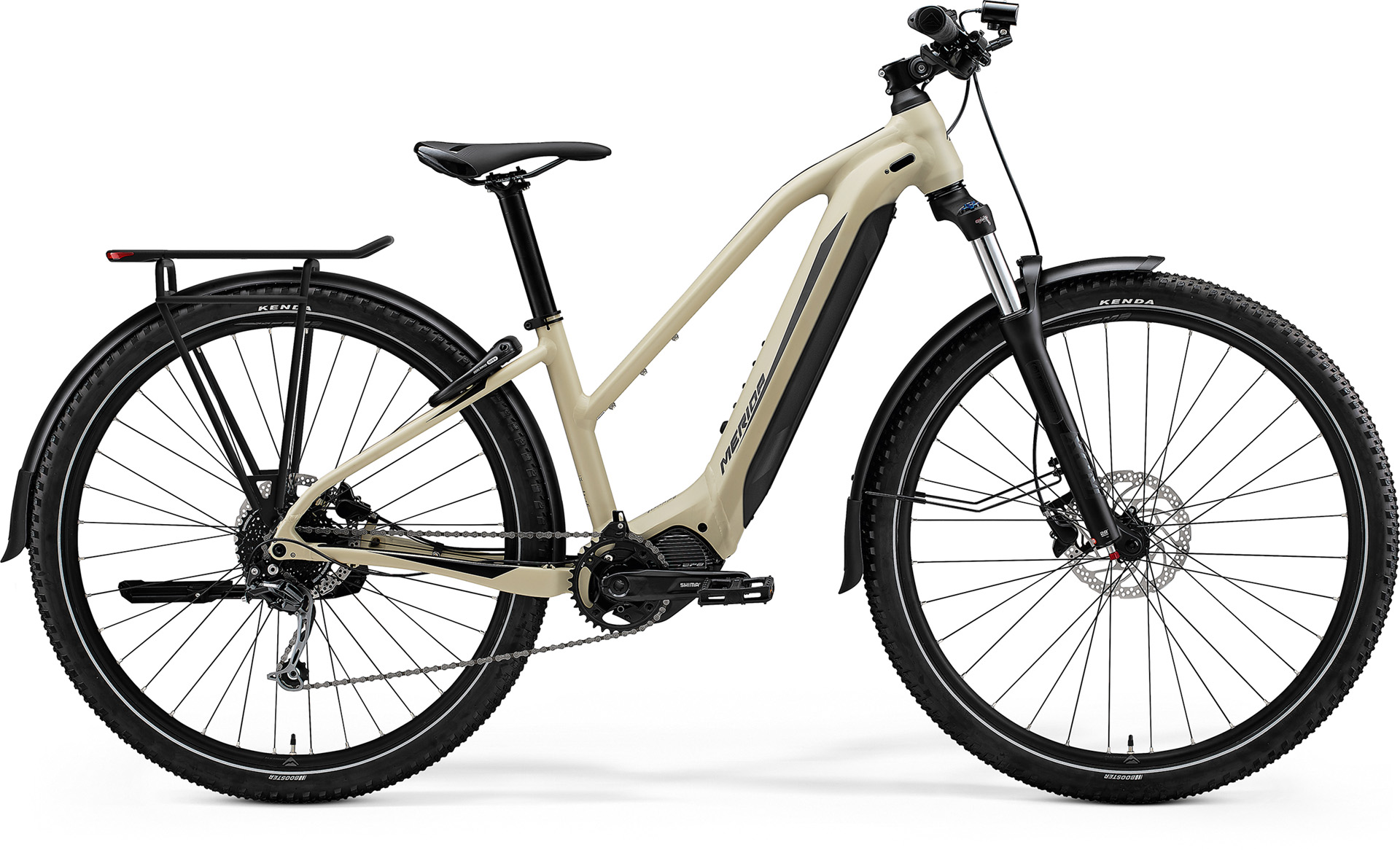 The eBIG.TOUR EQ combines the best of two worlds in the MERIDA line-up. From the outside a mountain bike but a trekking bike at heart. With a frame based on the eBIG.NINE, a suspension fork and wider 29er MTB tyres, the bike delivers a more comfortable riding feeling than a conventional trekking bike. However, as it comes fully equipped with fenders, carrier and lights, it is ideal for all tasks and duties you normally expect from a trekking bike or hybrid. The heavily bent down top tube offers incredible stand over height for easy mount and dismount.
